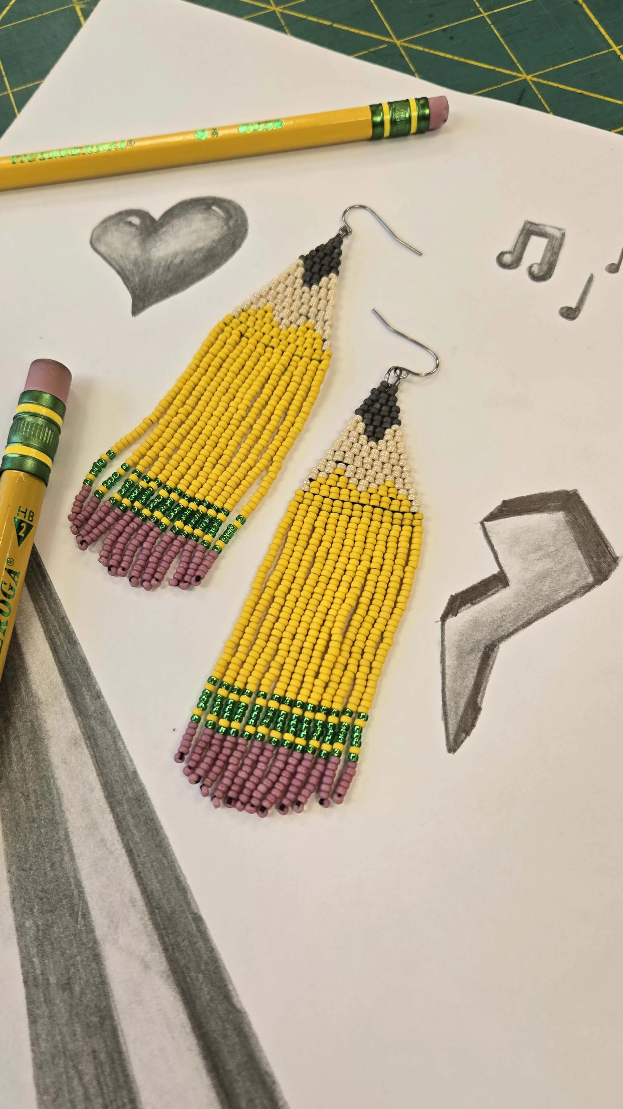 Categories: All earrings woven wearables necklaces other accessories All / Beaded Ticonderoga Pencil Earrings $80.00 Add to Cart Added! Beaded Pencil Fringe Earrings $60.00 Add to Cart Added! Beaded Crayon Earrings - Primary Red $70.00 Add to Cart Added! Beaded Crayon Fringe Earrings - Hunter Green $70.00 Add to Cart Added! Glow-in-the-Dark Fringe Beaded Ghost Earrings $70.00 Sold out Sold Out Added! Beaded Jack-o-Lantern - Orange and Clear Glow-in-the-Dark $55.00 Add To Cart Added! Beaded Jack-o-Lantern - Ivory and Pink Glow-in-the-Dark $55.00 Add to Cart Added! Beaded Jack-o-Lantern - Black Multi Colored $50.00 Add to Cart Added! Beaded Hoops $75.00 Add to Cart Added!